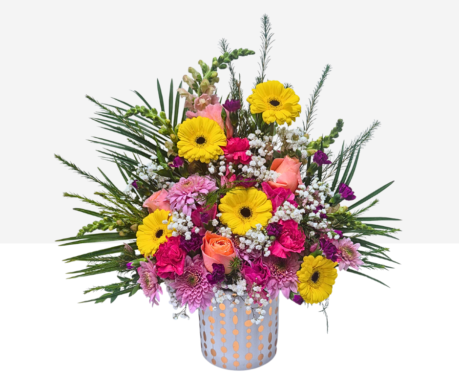 Bold, joyful, and bursting with color, Color Me Yours is a vibrant celebration of affection. Featuring sunny yellow gerbera daisies, lush pink and magenta blooms, peach roses, and delicate white accents, this arrangement radiates happiness and heartfelt charm. Designed with airy greenery and presented in a modern decorative container, it’s a fresh and playful take on Valentine’s Day florals.